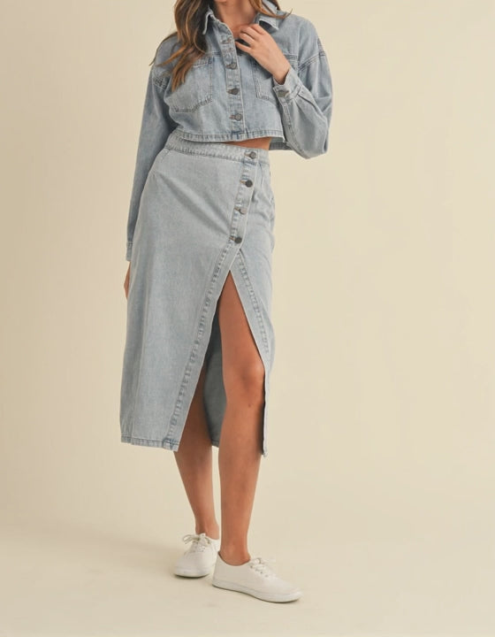 Looking for a fun and playful denim set? This button down crop jacket and matching midi skirt might just be the perfect choice! With features like a cropped length, collared neckline, boxy fit, and midweight fabric, this set offers both comfort and style. The skirt also includes 3 button closures, a side slit, and rear pockets for added flair. Made of 97% Rayon and 3% Spandex, this set is easy to care for with a simple hand wash and flat dry. Ready to rock this fun yet sexy look?