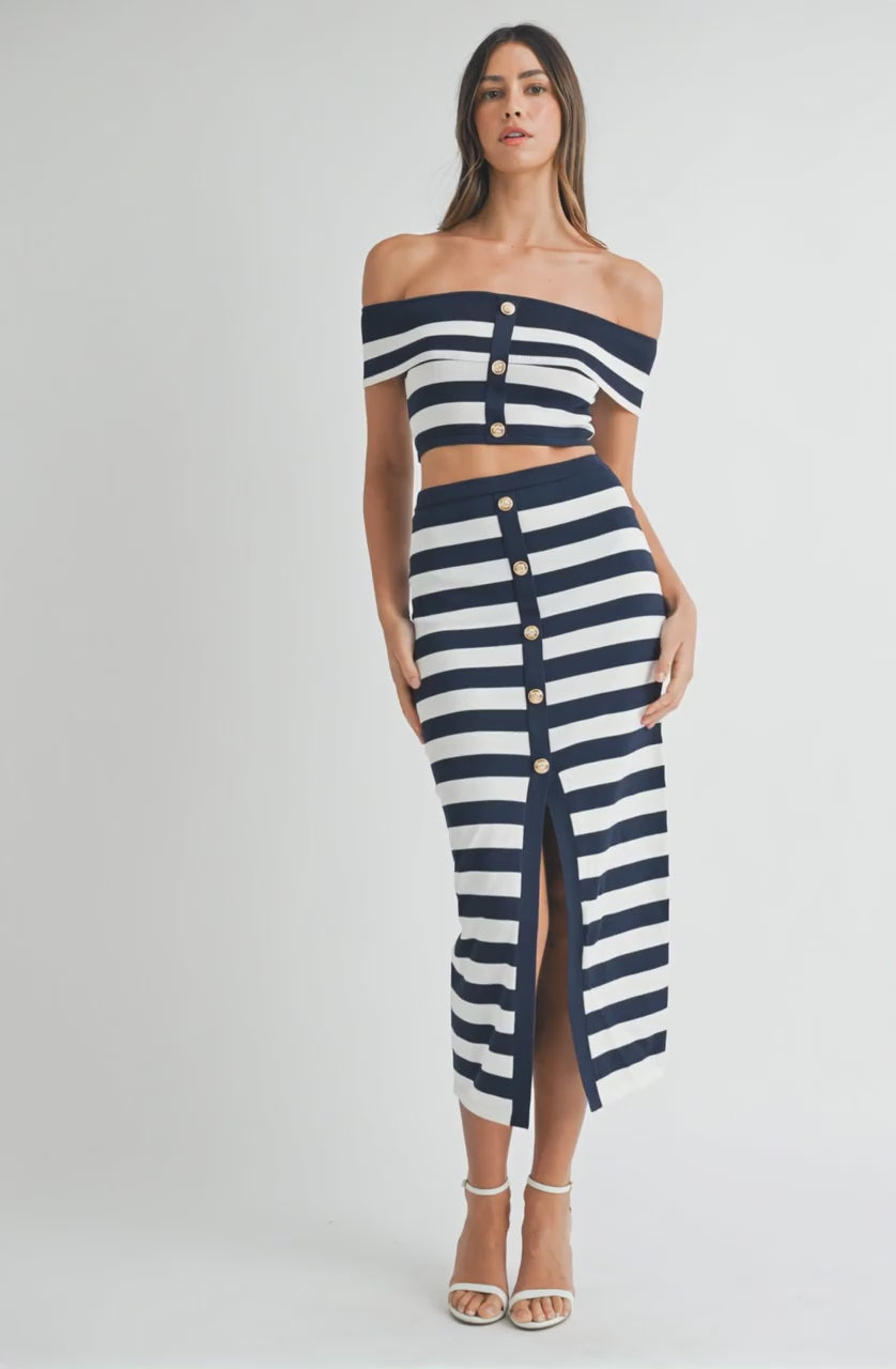 Introducing the Stasha Set, where chic meets playful sophistication in a stunning Navy/White Stripe. This ensemble drapes effortlessly over your silhouette, ensuring you feel as fabulous as you look. The delicate stripes dance with every movement, adding a touch of whimsy to your wardrobe while maintaining an air of refined elegance. Perfect for day-to-night transitions, the Stasha Set is your go-to for making a statement, whether you're brunching with friends or enjoying an evening soiree. Embrace the luxury of comfort and style—your fashion-forward self will thank you!